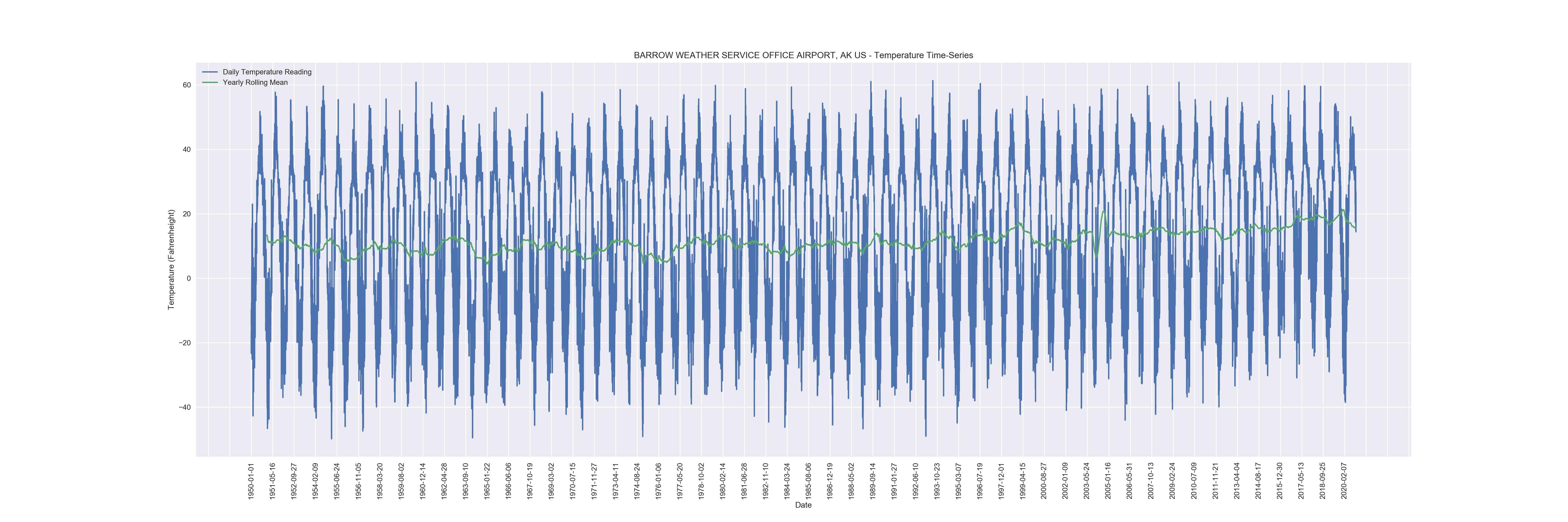 While it seems incredibly difficult to pull any information from the charts when using daily data over seven decades, once a yearly rolling mean is plotted, it’s a bit easier to see where the variability lies in the time series. Looking between the different sites, it looks as though warmer and coastal climates show a steady (if not relatively small) increase over the 70-year period. As expected, warmer climates averages tend to cluster more at higher temperatures with sharp spikes downward during the winter. A great example of this is the Tampa site. There seems to be more yearly variability in the colder climates, which is to be expected as they have a large range in temperatures yearly. It is interesting to note, however, that these coldest sites’ temperatures show their averages most central between their peaks of heat and cold. Almost all charts showed stronger variability in a period between 2011 and 2015; while this may be a sign of increased climate-change across the US, much more analysis would be required to make such a claim.